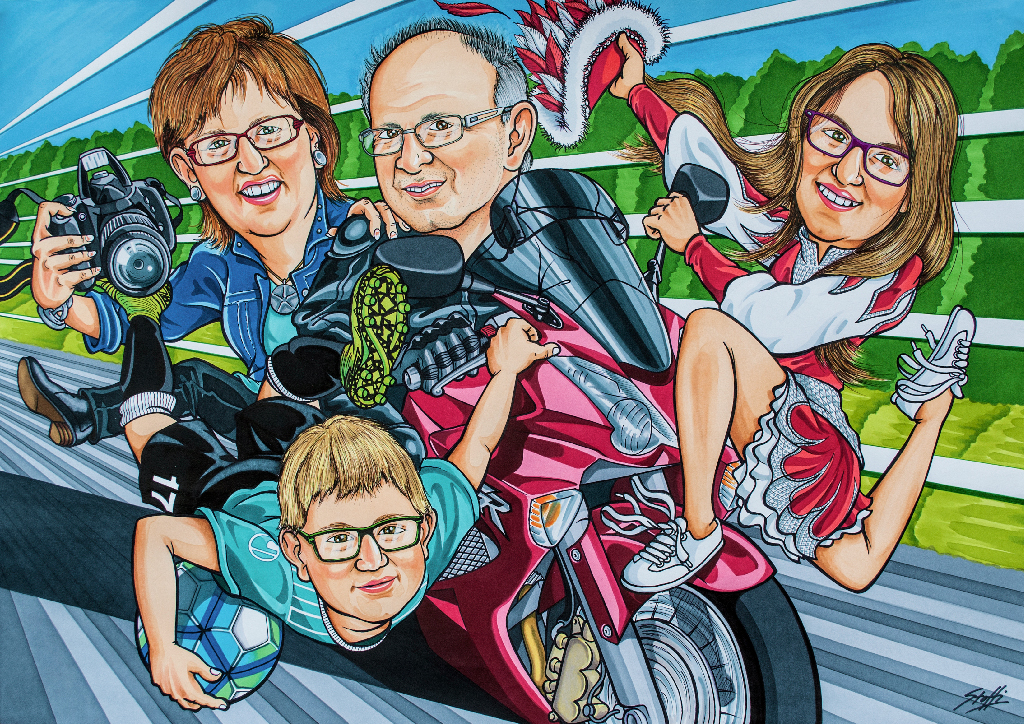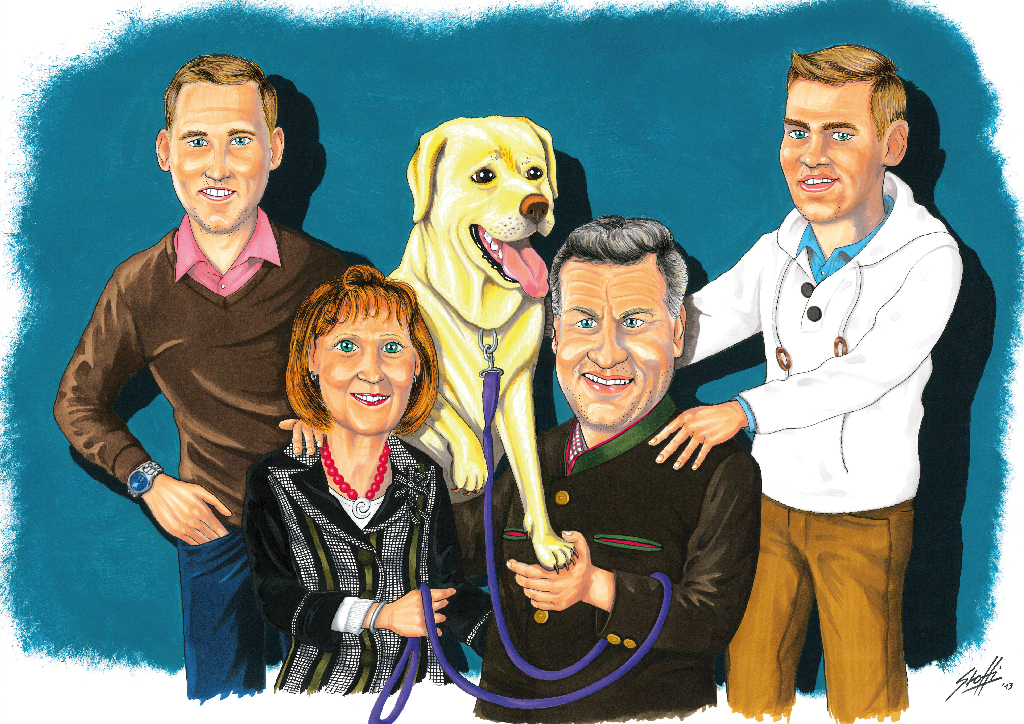 Karikatur einer Familie mit Darstellung der verschiedenen