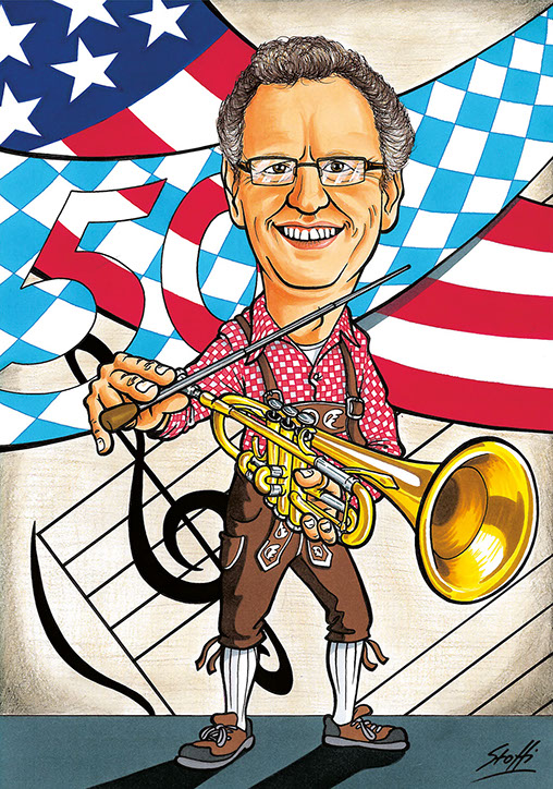 Karikatur einer Person zu deren Geburtstag mit Darstellung der persönlichen Vorlieben